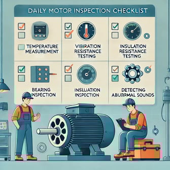 日常的なモーター点検は、故障の早期発見と予防に不可欠です。以下は、モーターの状態を把握し、異常を早期に発見するための具体的なチェックリストです。